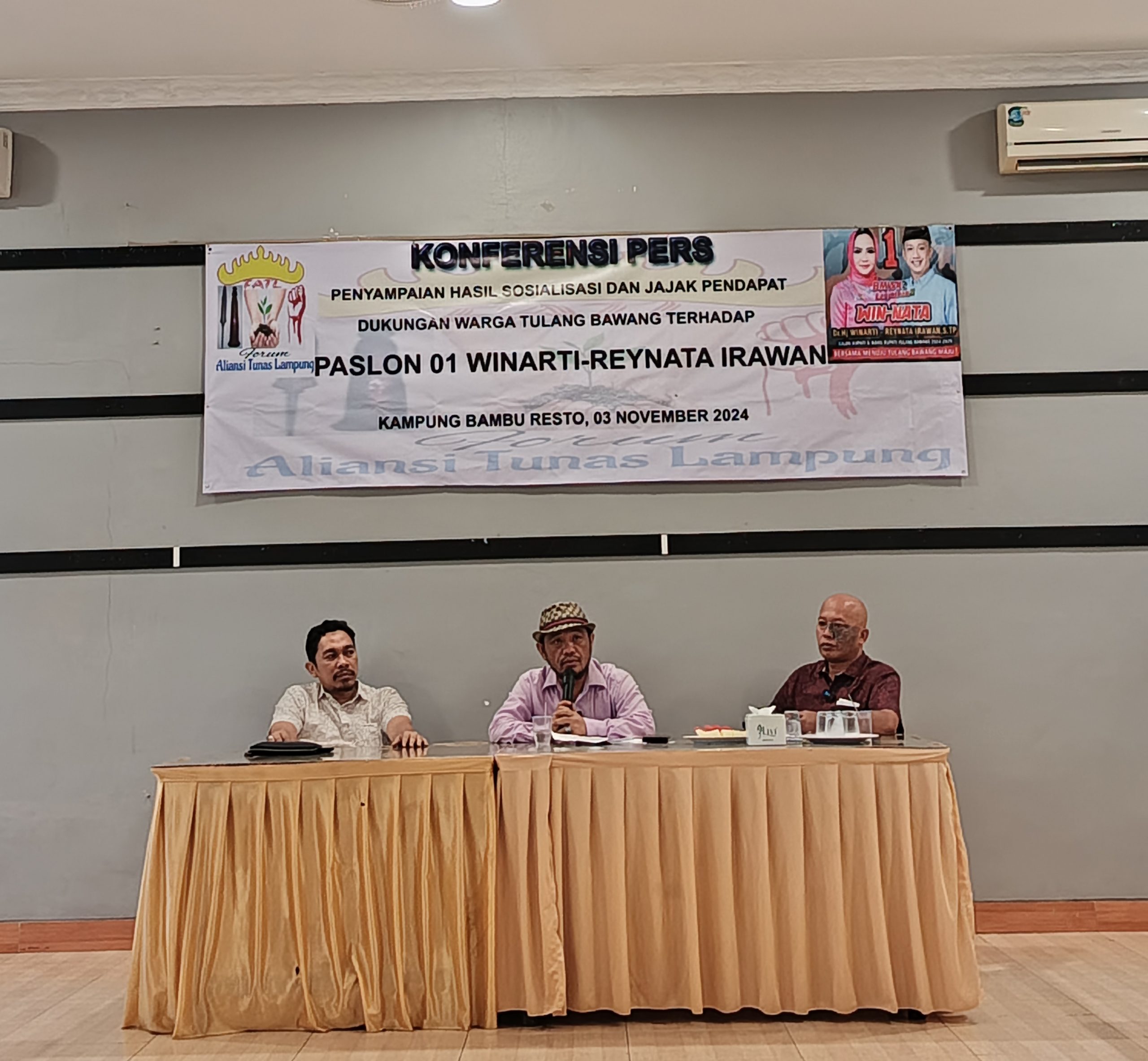 JURAI.ID, BANDAR LAMPUNG (SMSI) – Aliansi Tunas Lampung melakukan kegiatan Konferensi Pers mengenai Hasil Sosialisasi dan Jajak Pendapat Dukungan Warga Tulang Bawang Terhadap Pasangan Calon 01 Winarti-Reynata Irawan.