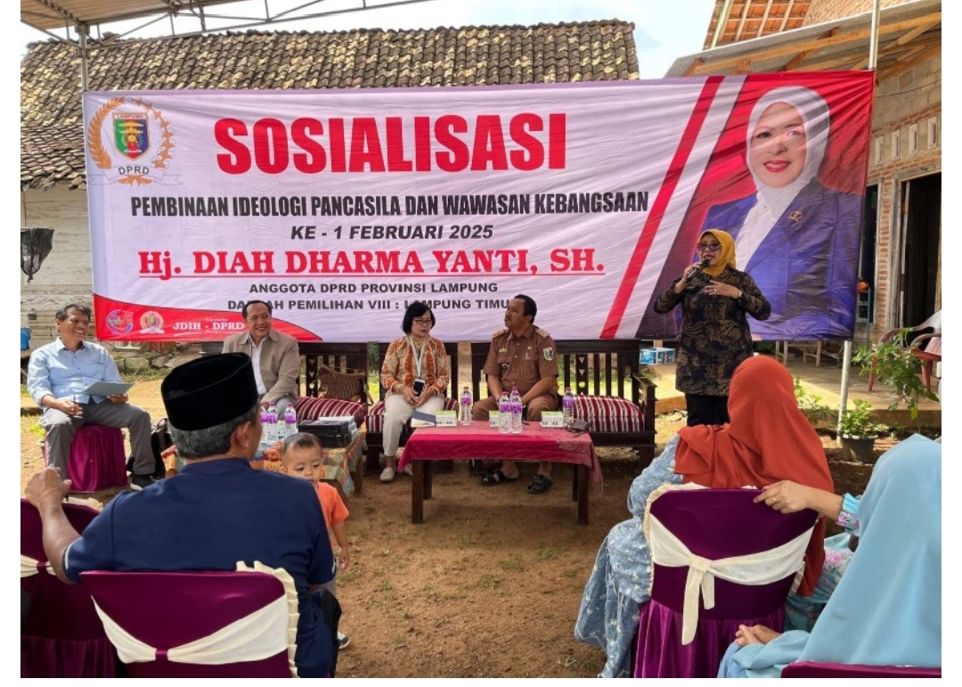 JURAI.ID, LAMPUNG TIMUR (SMSI) – Anggota DPRD Lampung, Diah Dharma Yanti, menyosialisasikan Pembinaan Ideologi Pancasila dan Wawasan Kebangsaan (PIPWK) di Dusun V Desa Sribhawono, Kabupaten Lampung Timur, Selasa (11/2/2025).
