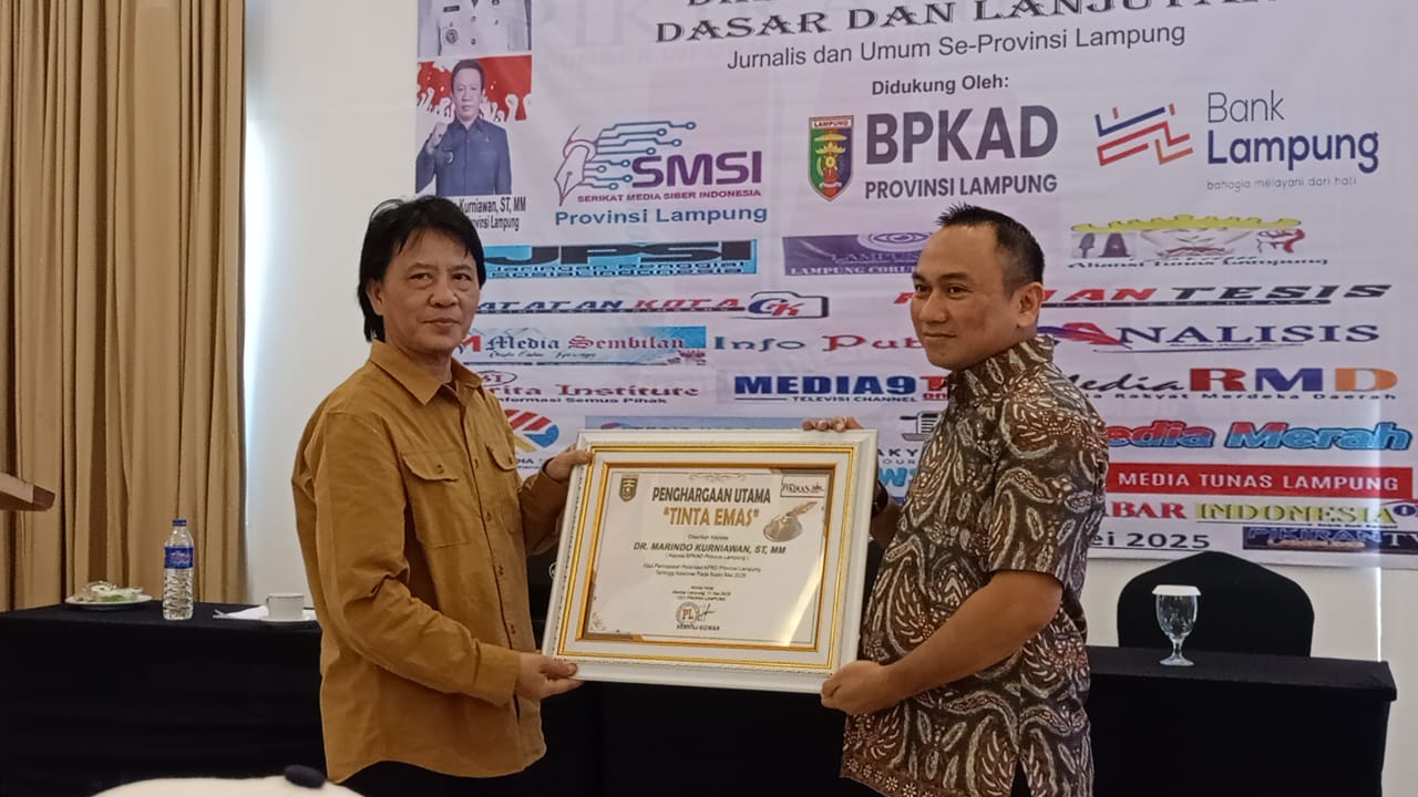 Penghargaan Emas tersebut diterima oleh Kepala Bidang (Kabid) Perencanaa Anggaran Daerah, Nurul Fajri yang hadir sekaligus jadi pemateri pada acara Diklat Jurnalistik Dasar dan Lanjutan Media Pikiran Lampung Grup yang digelar di Hotel Alodia, Bandar Lampung, Sabtu (31/05/2025).