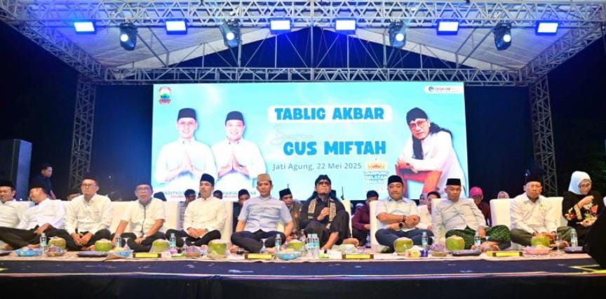 JURAI.ID, LAMPUNG SELATAN (SMSI)-Ribuan warga Lampung Selatan, khususnya di Kecamatan Jati Agung menghadiri Tabligh akbar yang mendatangkan ustaz kondang Gus Miftah, di Lapangan Kantor Kecamatan Jati Agung, Kamis malam (22/5/2025).