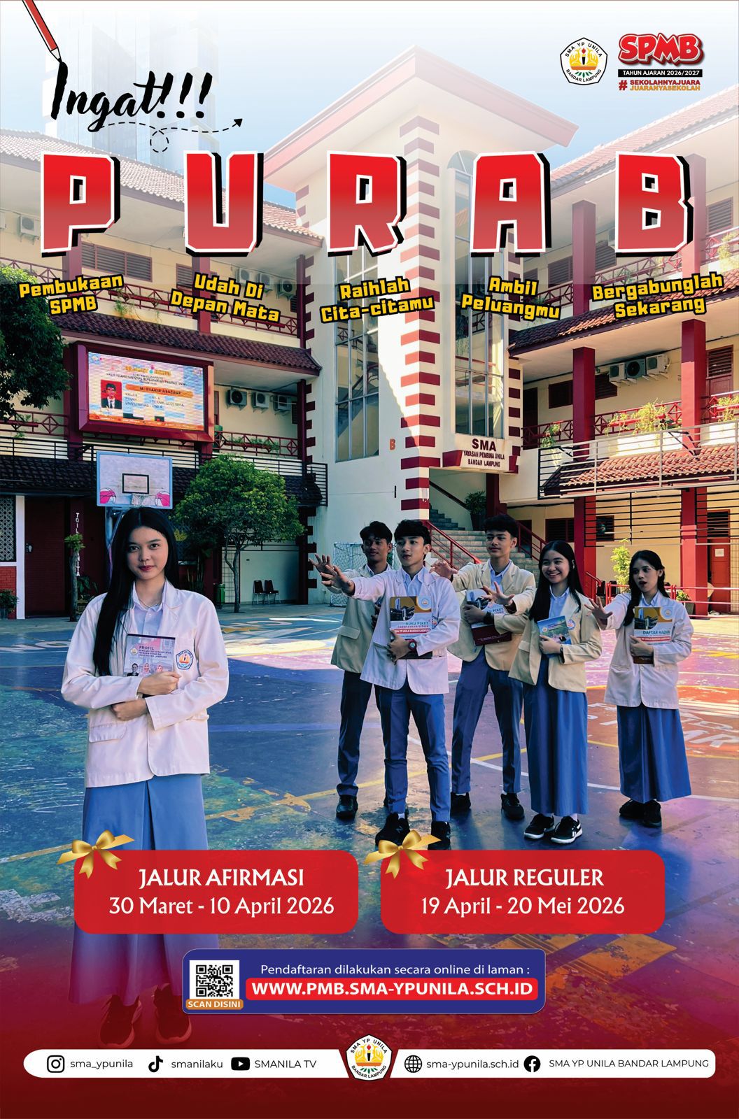 JURAI.ID, BANDARLAMPUNG (SMSI) – SMA YP Unila Bandar Lampung kembali membuka kesempatan bagi calon peserta didik baru melalui Sistem Penerimaan Murid Baru (SPMB) Tahun Ajaran 2026/2027. Penerimaan tahun ini dibuka melalui dua jalur, yakni Jalur Afirmasi dan Jalur Reguler, sebagai bentuk komitmen sekolah dalam memberikan akses pendidikan yang inklusif dan berkualitas.