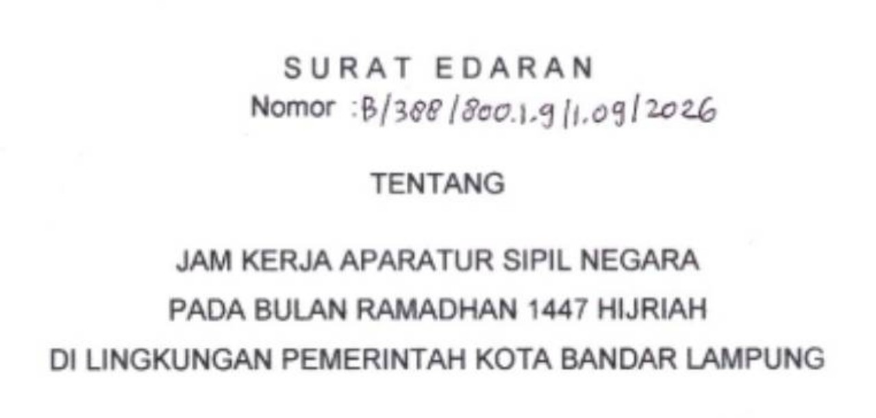 JURAI.ID, BANDAR LAMPUNG (SMSI) – Walikota Bandarlampung, Eva Dwiana, menerbitkan surat edaran (SE) tentang jam kerja Aparatur Sipil Negara (ASN) selama Ramadan 1447 Hijriah di lingkungan Pemerintah Kota Bandarlampung.